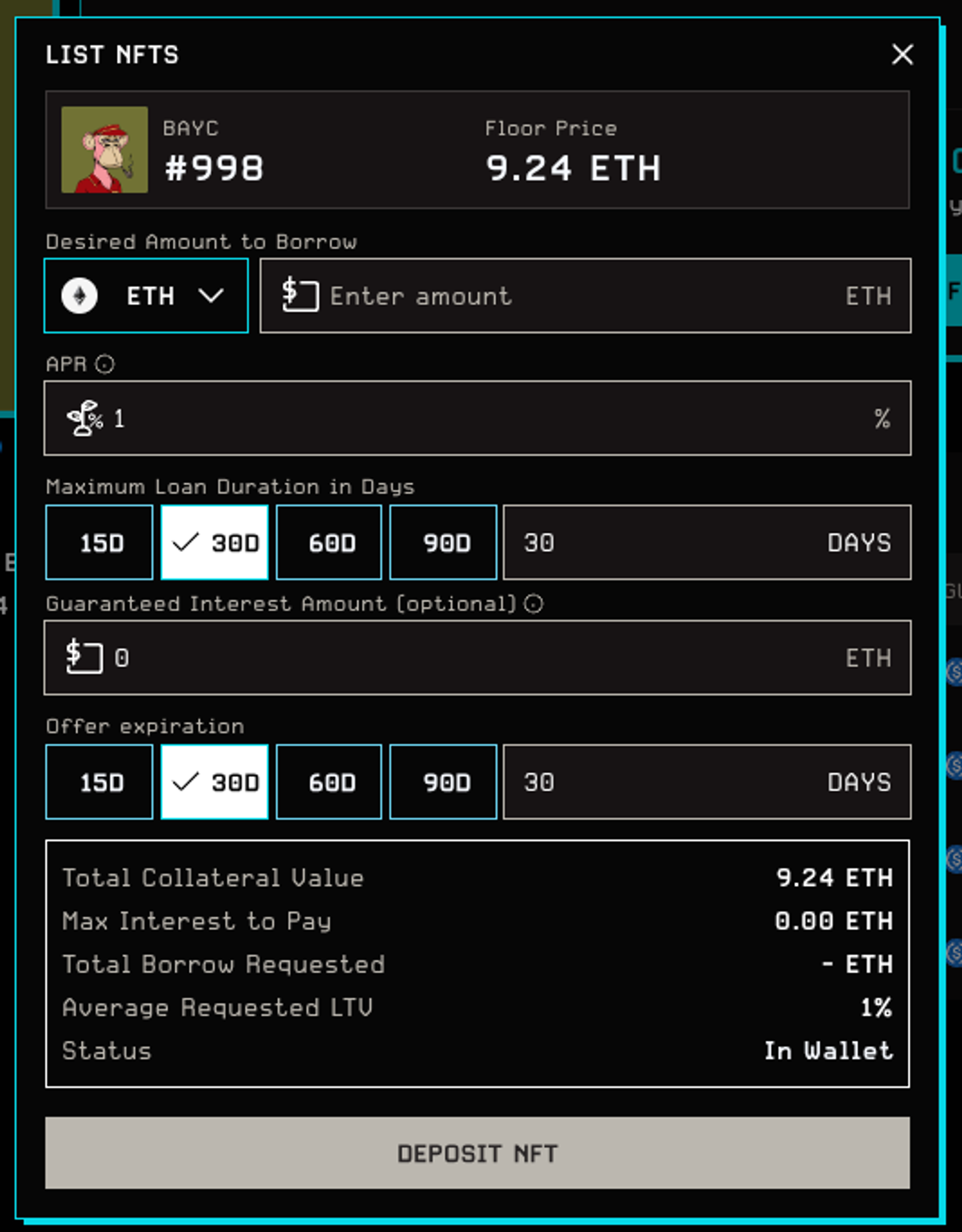 Set your terms in the Listing Modal. Specify the principal amount, APR, loan duration, offer expiration, and an optional origination fee.