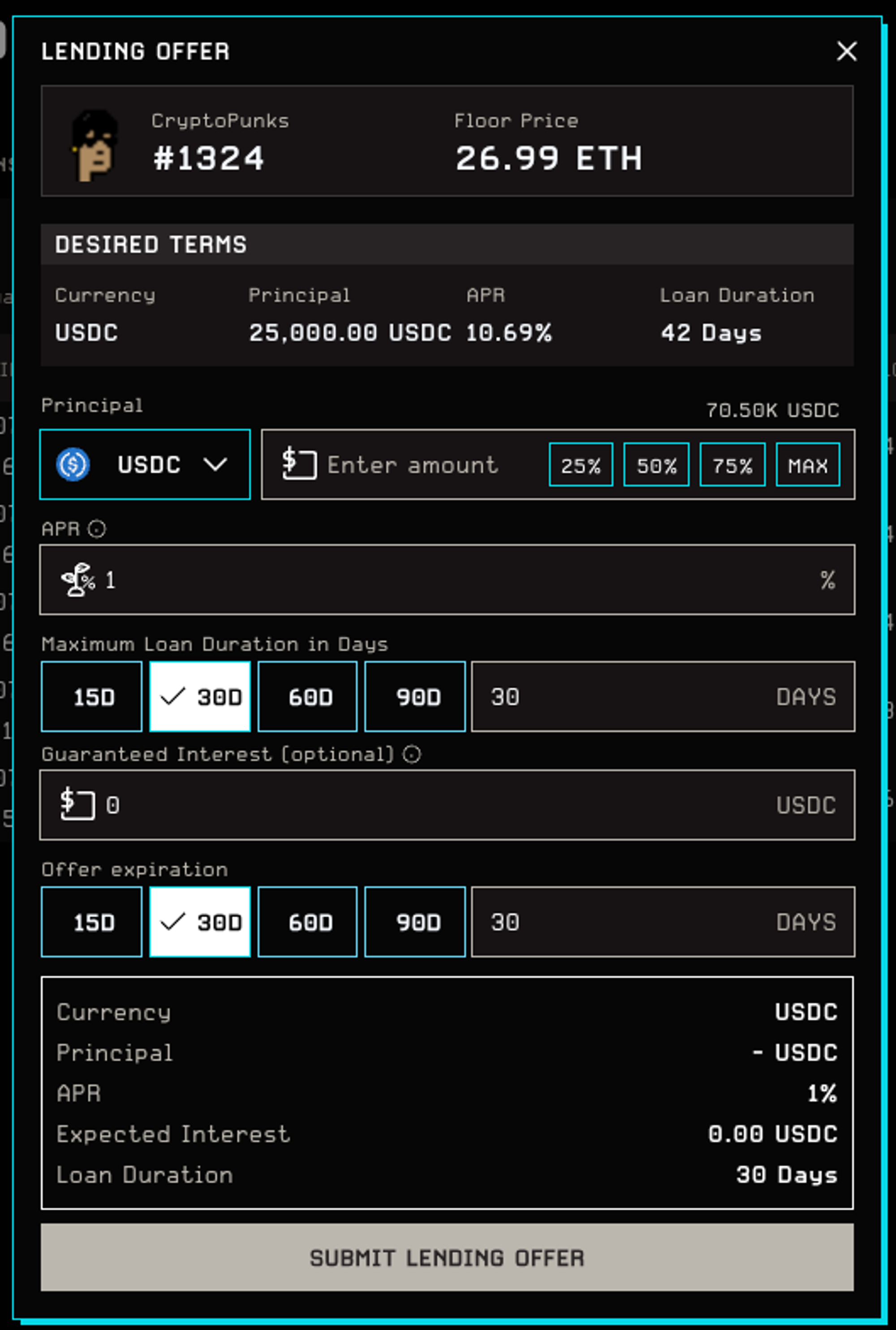 Make Offer: Propose your terms including principal amount, APR, loan duration, offer expiration, and an optional origination fee. This will deposit the offered principal amount in the escrow contract.